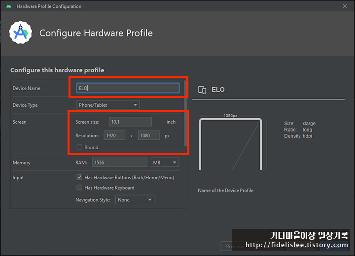 새로운 Profile 추가 화면에서 Custom단말기의 화면크기와 Resolution 등을 지정해 주고 이후 HW키보드나 카메라 등에 대한 정보도 넣어준 다음 완료하게 되면 끝~~~