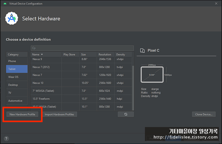 AVD Manager를 통해서 Custom Device Profile을 추가해 주면 된다.